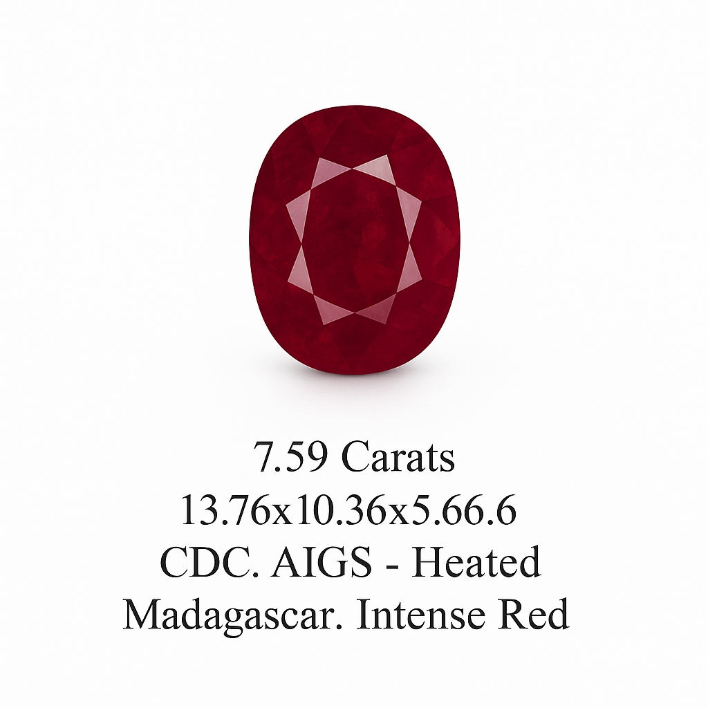 This Oval Intense Red Ruby has a total carat weight of 7.59 ct. with Heated Enhancement. The dimensions are 13.76x10.36x5.66. The country of origin is Madagascar.