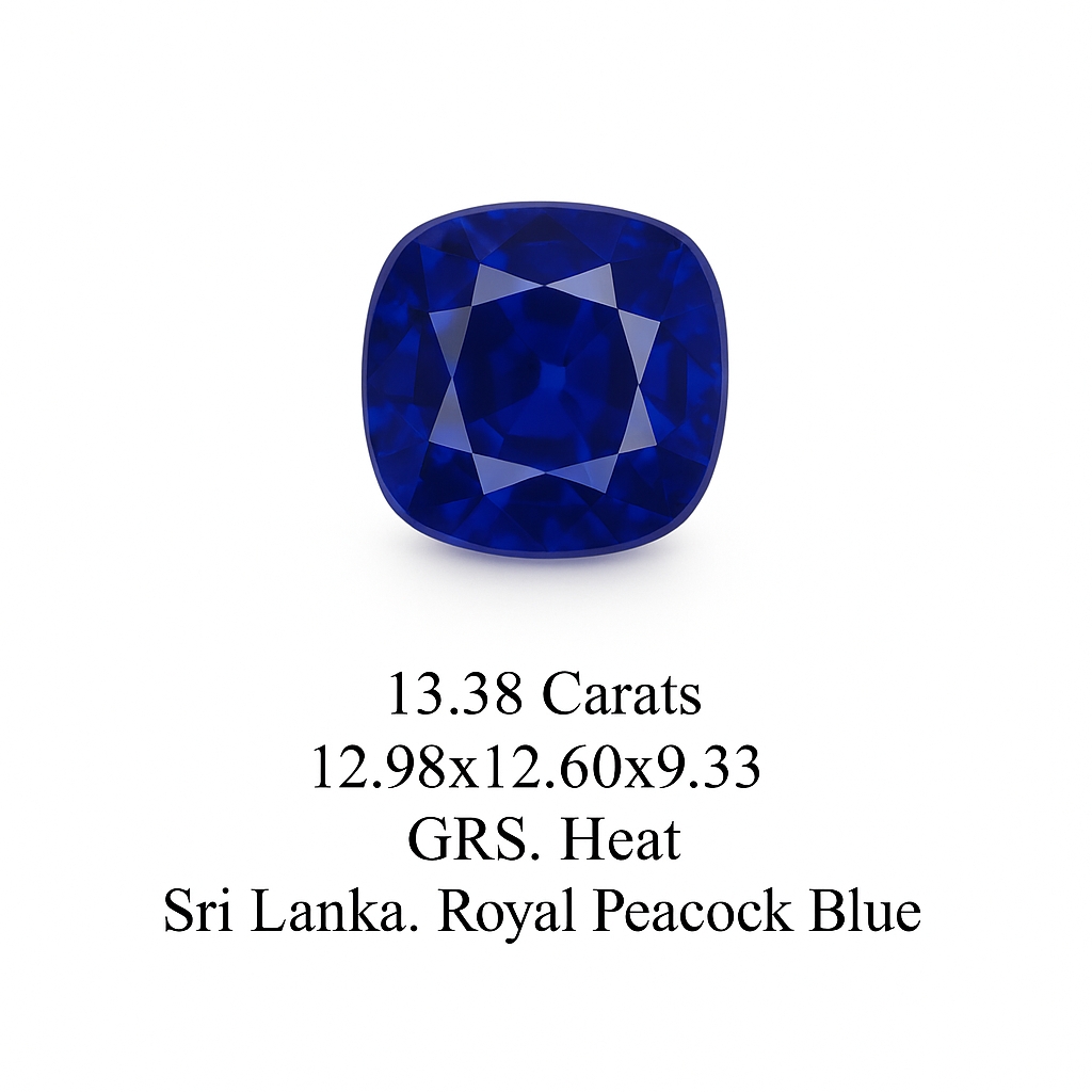 This Cushion Royal Blue Sapphire has a total carat weight of 13.38 ct. with Heated Enhancement. The dimensions are 12.98x12.6x9.33. The country of origin is Sri Lanka.