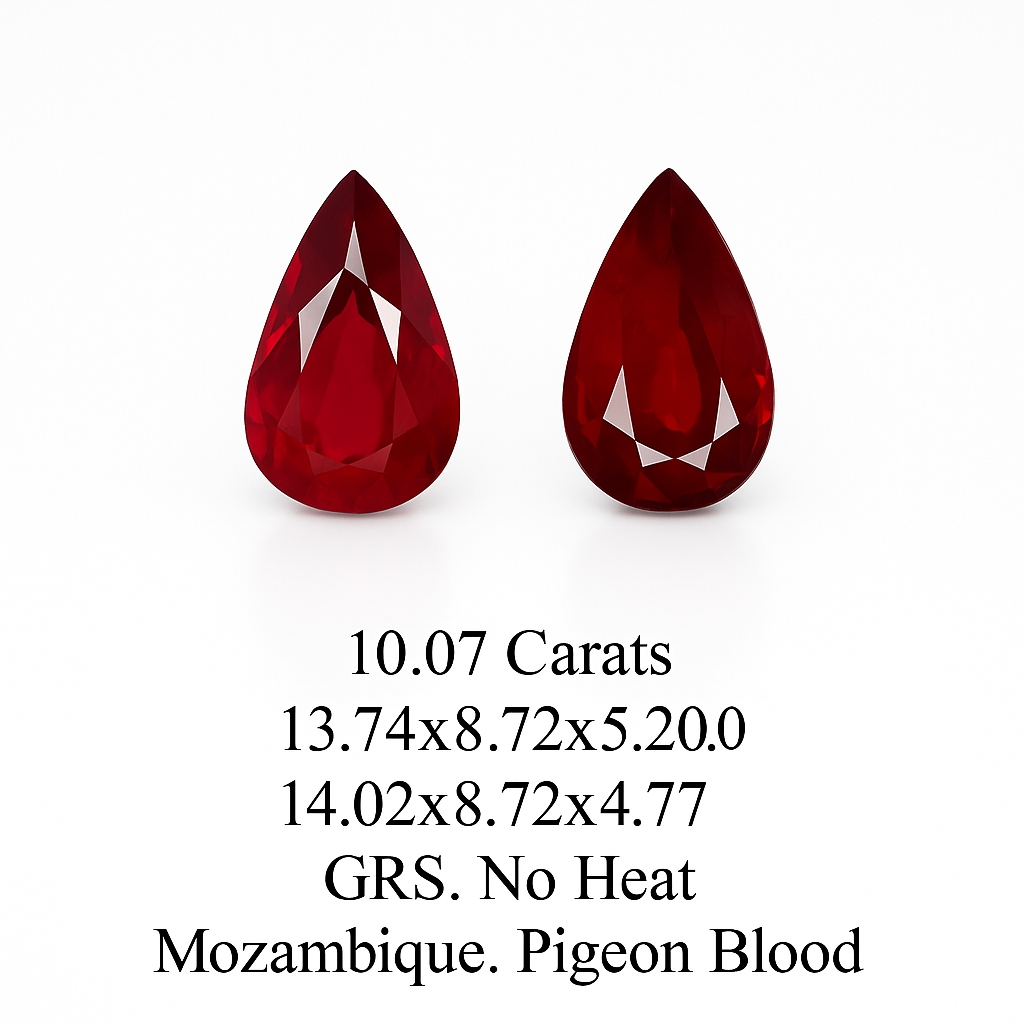 This Pear Shape Pigeon Blood Ruby has a total carat weight of 10.07 ct. with No Heat Enhancement. The dimensions are 13.74x8.72x5.2. The country of origin is Mozambique.