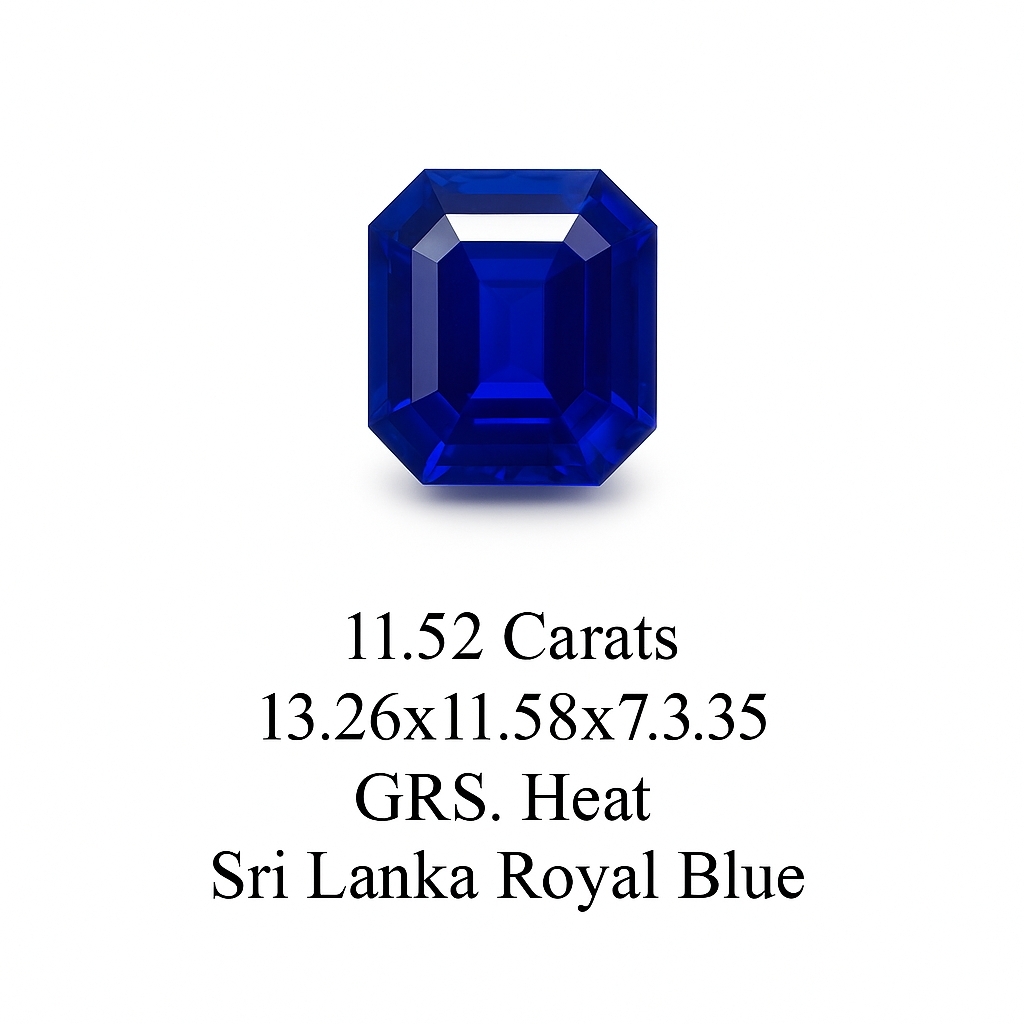 This Emerald Cut Royal Blue Sapphire has a total carat weight of 11.52 ct. with Heated Enhancement. The dimensions are 13.26x11.58x7.35. The country of origin is Sri Lanka.