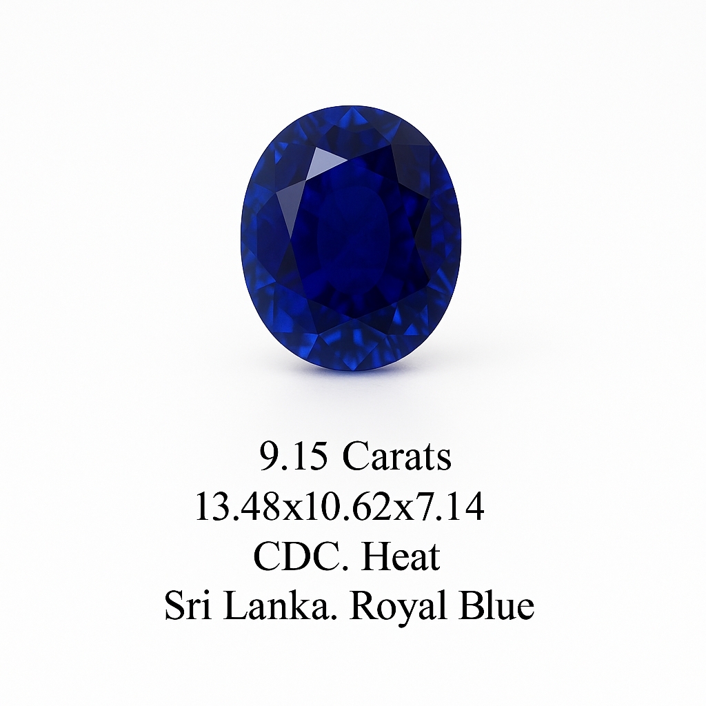 This Oval Royal Blue Sapphire has a total carat weight of 9.15 ct. with Heated Enhancement. The dimensions are 13.48x10.62x7.14. The country of origin is Sri Lanka.